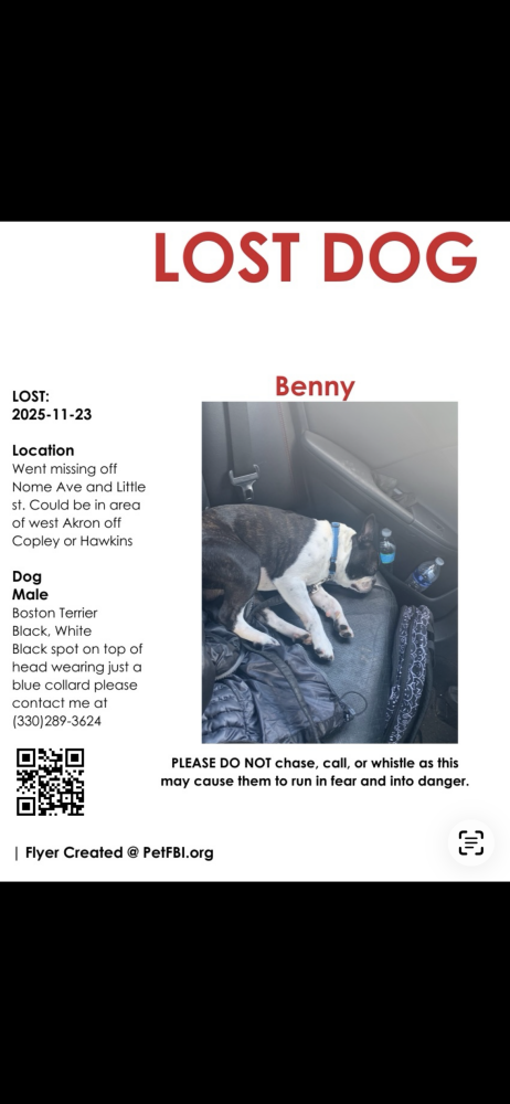 Pet Description:Small dog black and white with a black spot on top of head. Has on just a blue collard. |