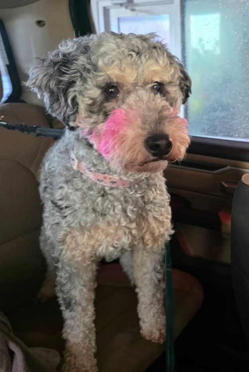 Pet Description:Misu is a 3 year old doodle mix. She is grey with black spots and pink cheeks |