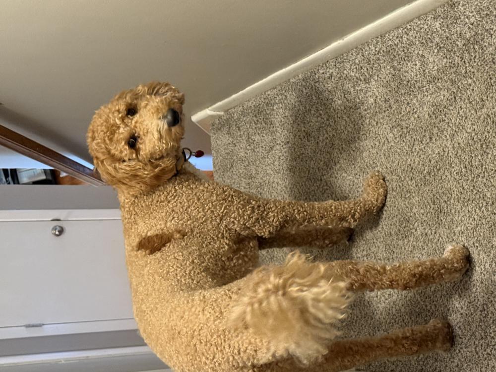 Pet Description:Full bread poodle. Looks like a golden doodle. Very tall and lengthy - around 70lbs. He has 2 brown spots on his sides. He is scared of people, but is nice and will not bite humans or other animals. |