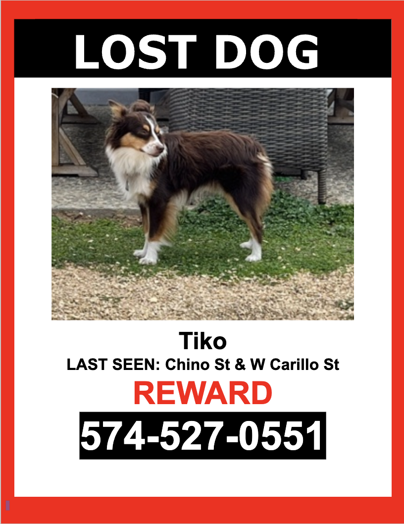 Pet Description:LOST PET - BROWN & WHITE / AUSTRALIAN SHEPHERD / MALE - $$ Reward $$**MISSING SINCE 11/26/2025 AT 1:00 PM**Tiko is a male, Brown & White, Australian Shepherd who escaped and was last seen near Chino St & W Carillo St.Tiko is wearing His COLLAR with tags.If you see Tiko please DO NOT CHASE HIM.PLEASE CALL OR TEXT ONLY.574-527-0551$$ Reward $$ |