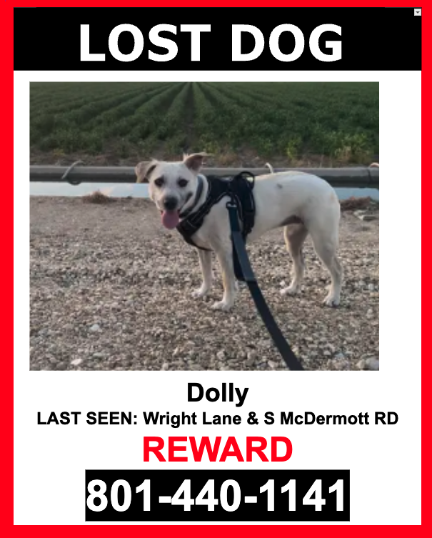Pet Description:LOST PET - WHITE/MIXED BREED / FEMALE - $$ Reward $$**MISSING SINCE 11/24/2025 AT 05:00 PM** DOLLYis a FEMALE, WHITE/MIXED BREED who escaped and was last seen near WRIGHT LANE & S MCDERMOTT RD. DOLLY is wearing HER COLLAR without tags and IS NOT microchipped. If you see DOLLY please DO NOT CHASE HER. PLEASE CALL OR TEXT ONLY. 801-440-1141$$ Reward $$ |