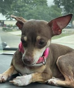 Pet Description:Cocomelon is a small female Chihuahua that is mostly brown with some tan and white markings. She has short hair and a smooth coat with small tan colored eyebrows. Coco has white fur on her chest area and her left foot has slightly more white on it than the right foot. She has an upside heart-like shape on her chest. She is hairless under her neck and stomach area. Her toenails and paw nails have a light tint. She has a long skinny tail and big pointy ears. |