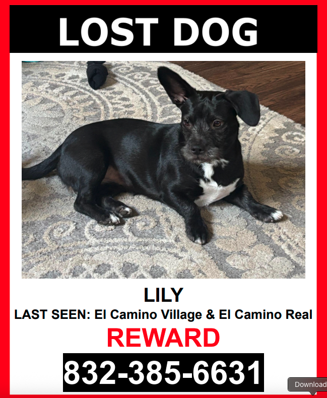 Pet Description:**MISSING SINCE 11/27/2025 AT 6:00 PM** Lily is a female, black Dachshund and Miniature Schnauzer who escaped and was last seen at Las Palmas apartments on El Camino Village Dr Lily is not wearing a collar and has white markings on her chest. If you see Lily please DO NOT CHASE HER. PLEASE CALL OR TEXT ONLY. 832-385-6631$$ Reward $$ |