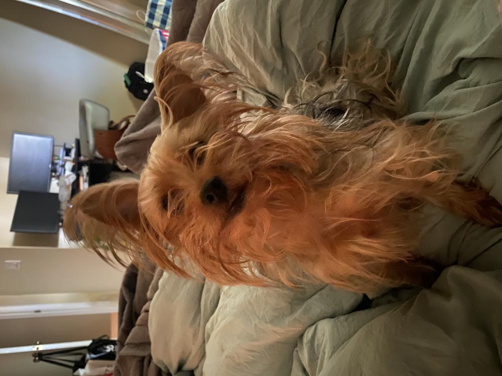 Pet Description:Small golden yorkie. She is wearing a pink harness |