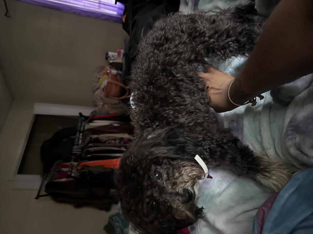 Pet Description:Muffin is a friendly shy dog if you see her please pick her up she will not bite you ! My number is on her pink collar if she still has it on. . Black with white paws and white chest and curly hair! |