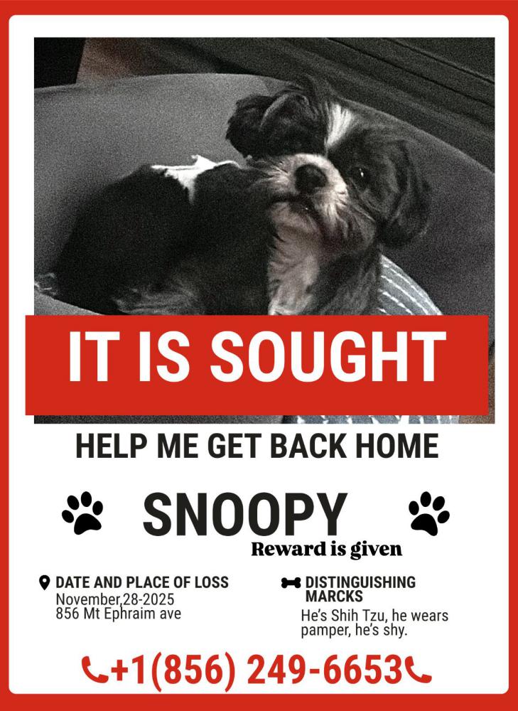 Pet Description:Small gray and white Shih Tzu wearing a white diaper, his name is Snoopy, he doesn't bite and is friendly |