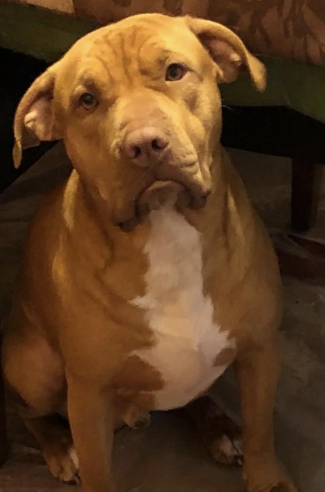 Pet Description:He is a friendly dog but not outside dog he’s dark tan with white patch on his chest |