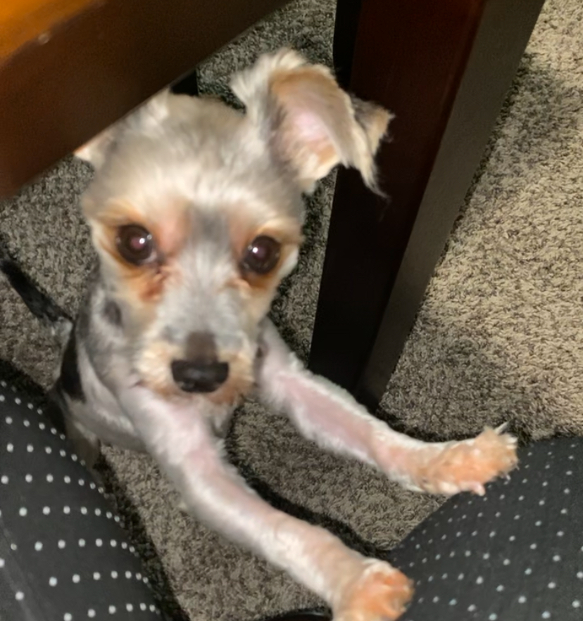 Pet Description:Milo is a Yorkie with a fur coat that blends white, black, and gray. He's one year old! |