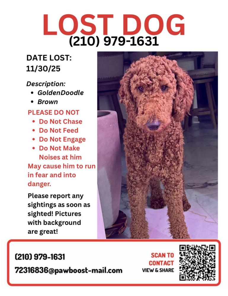 Pet Description:large brown goldendoodle with a curly, brown coat, last seen wearing a blue bow tie. He can be cautious around strangers and may be hesitant to approach unfamiliar people. |