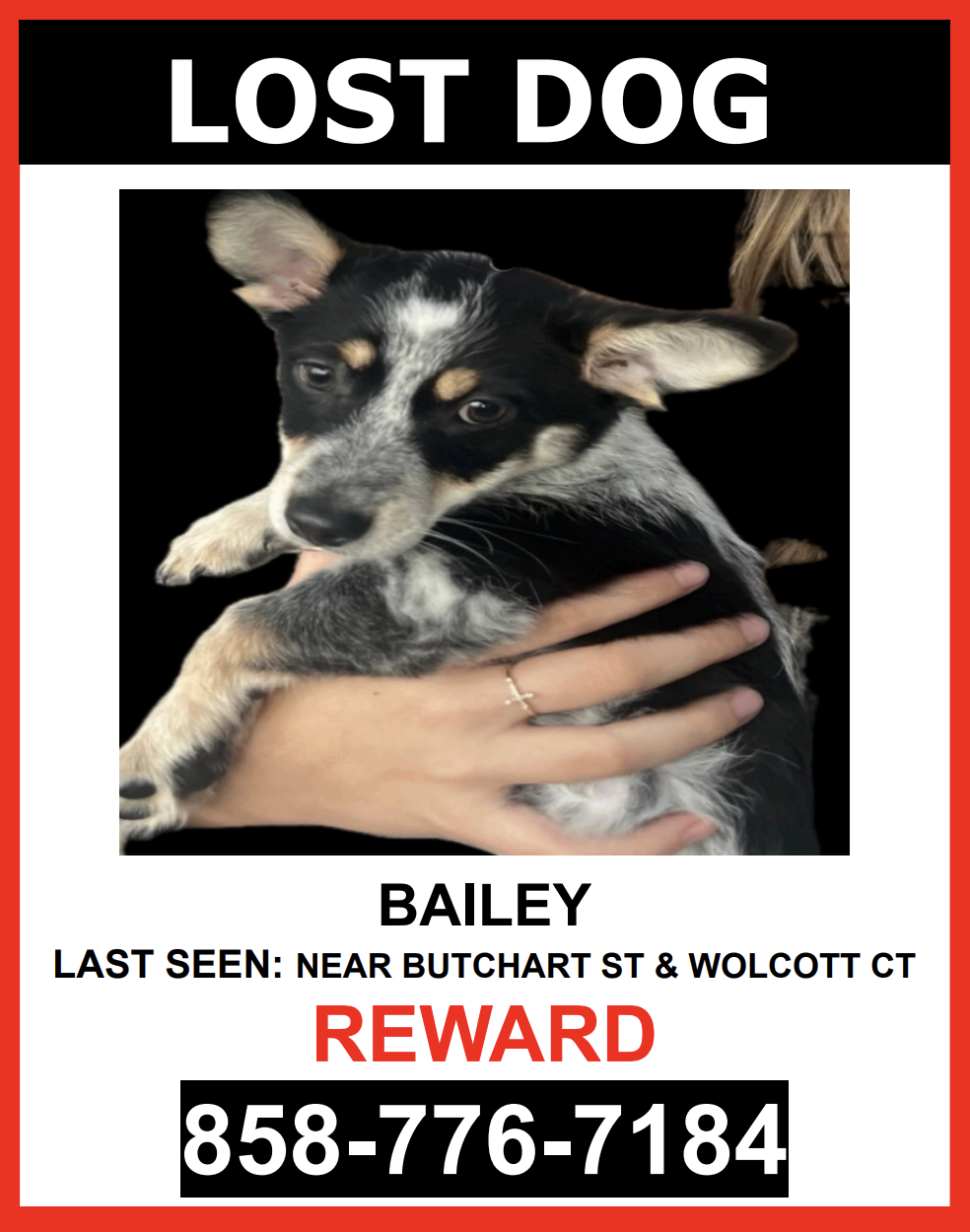 Pet Description:**MISSING SINCE 12/07/2025 AT 6:00 PM** BAILEY is a MALE, TRI-COLORED, MIXED BREED who escaped and was last seen near BUTCHART ST & WOLCOTT CTIf you see BAILEY, please DO NOT CHASE HIM. PLEASE CALL OR TEXT ONLY. 858-776-7184$$ Reward $$ |