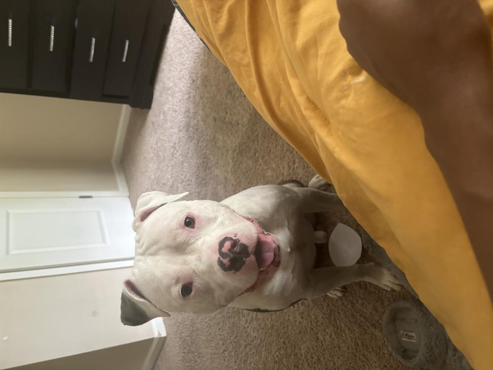 Pet Description:White and blue bully, classic big head! Scar on right side from previous injury’s he’s not fixed! |
