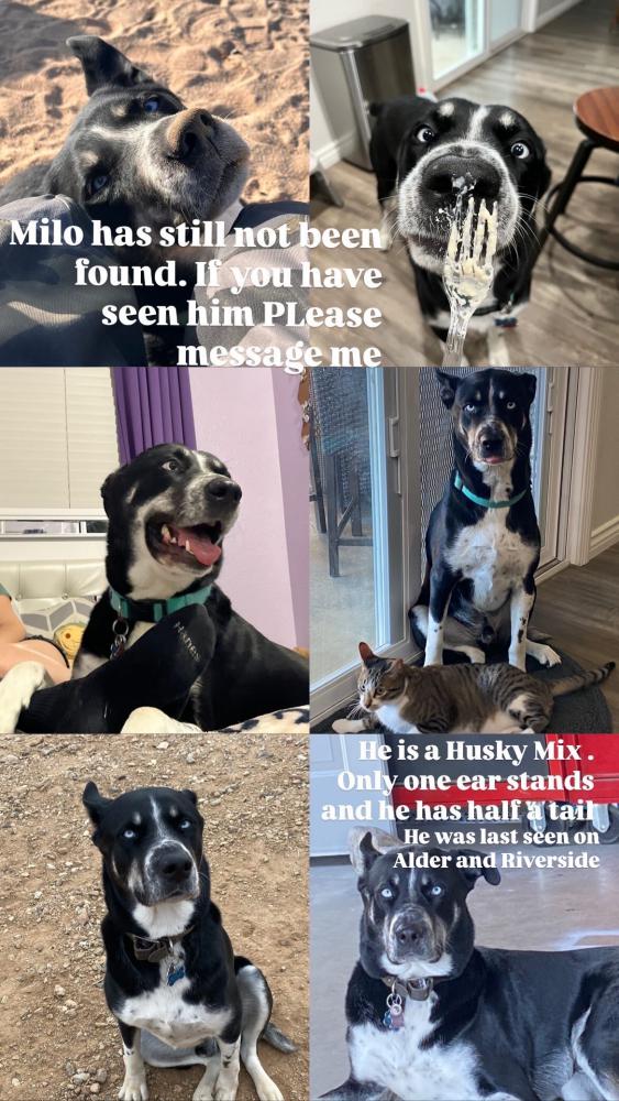 Pet Description:8yr old husky mix One standing ear the other flops Has half a tail |