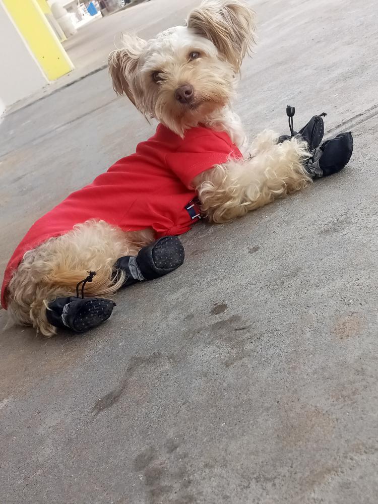 Pet Description:He is york shire terri. When he got out the yard he had this red. Dog Adidas sweat suit. Little boots... |
