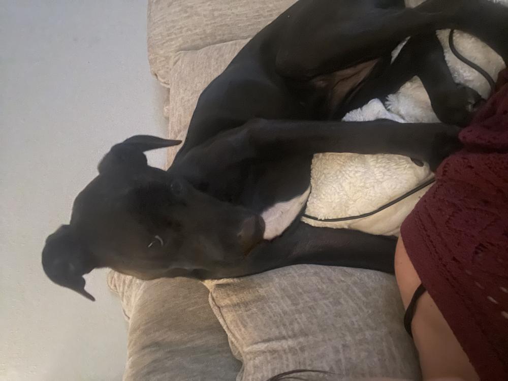 Pet Description:Black lab mix wide white stripe on chest blue collar one foot has small markings of white fur |