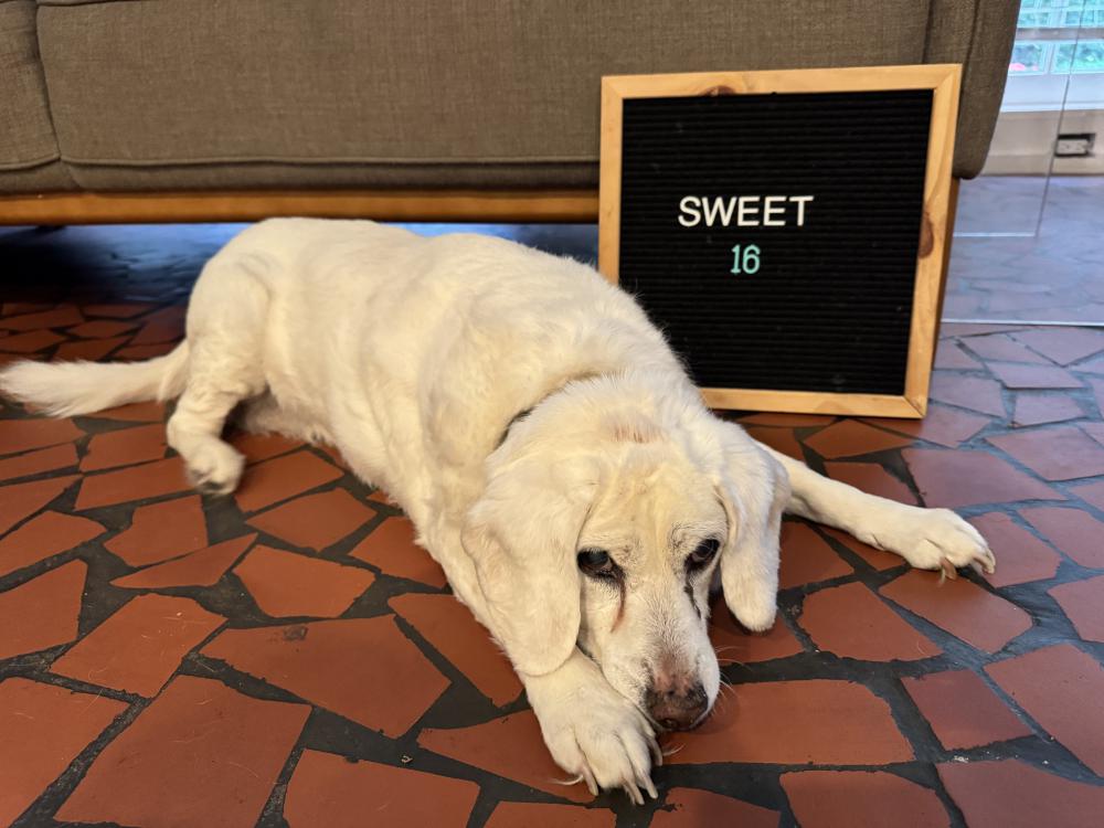 Pet Description:16 year old white beagle mix. Deaf and partially blind. Wearing faded green and pink collar. The sweetest! |