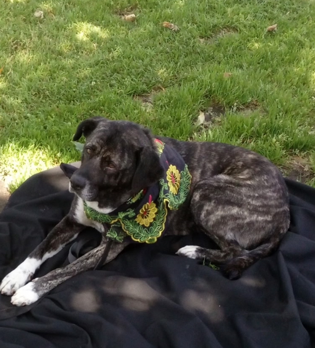 Pet Description:Large mixed breed possibly cane corso or pit bull. Spayed brindle female with white on tips of paws and chest. Nami is microchipped |