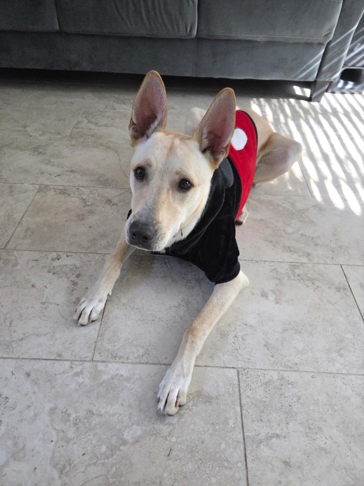 Pet Description:Hes a shepherd mix, medium, tan/white, curled tail, pointed ears |
