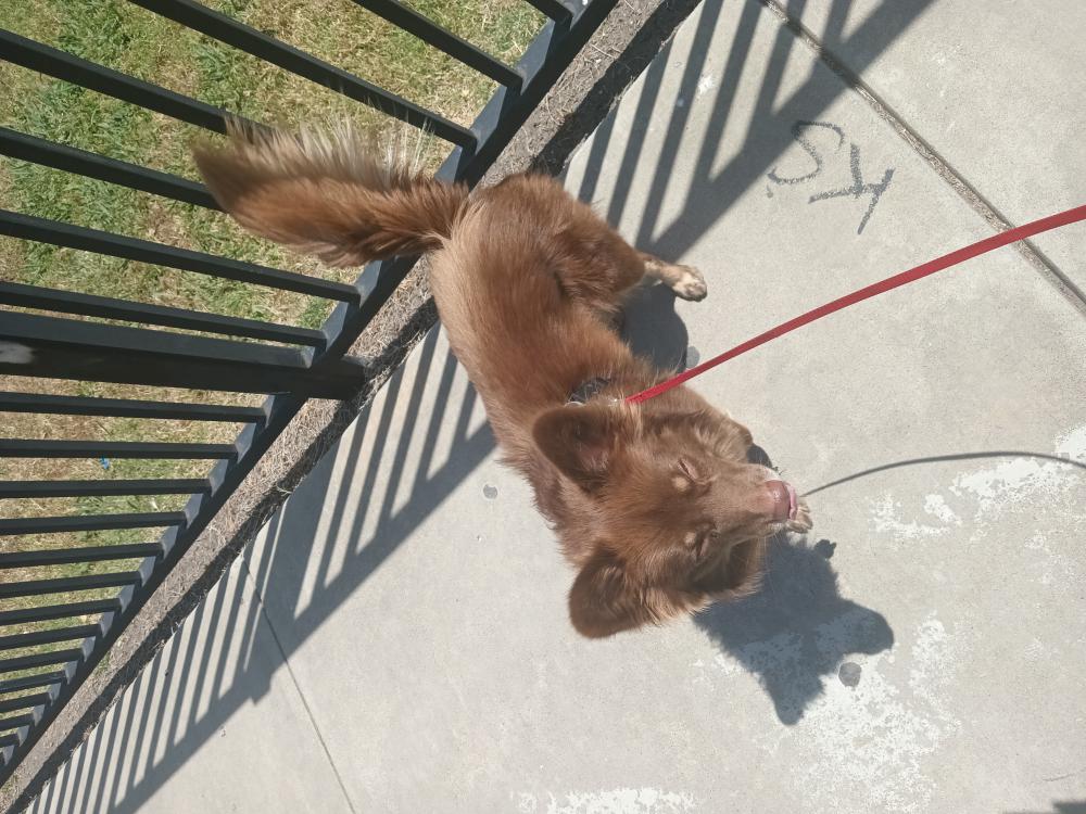 Pet Description:Mid-sized Brown Husky Brown harness ears that stand straight up and a very fluffy tail Chipped |
