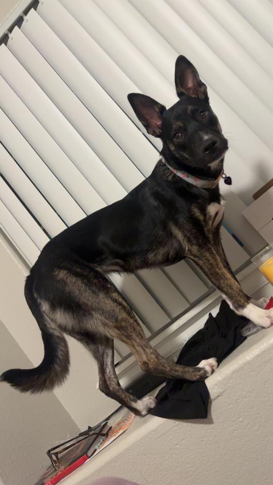 Pet Description:8 month old female spayed dutch shepherd mix, about 35 lbs. Has white chest and brindle legs. Has a pink collar and a leash attached |
