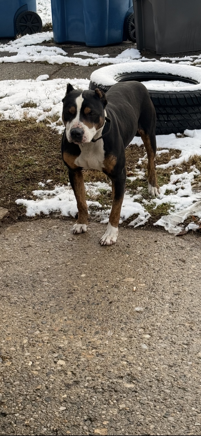 Pet Description:Black brown white pit bull clipped ears really well behaved |