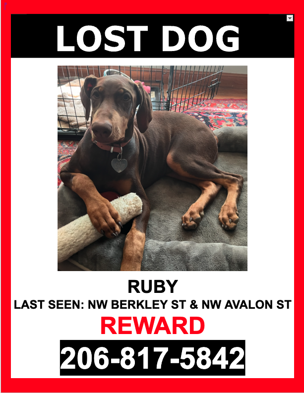 Pet Description:**MISSING SINCE 12/12/2025 AT 10:00 AM** RUBY is a FEMALE, RED, DOBERMAN who escaped and was last seen near NW BERKLEY ST & NW AVALON ST. RUBY is wearing HER LIGHT PINK COLLAR with tags and IS microchipped. If you see RUBY, please DO NOT CHASE HER. PLEASE CALL OR TEXT ONLY. 206-817-5842. $$ Reward $$ |