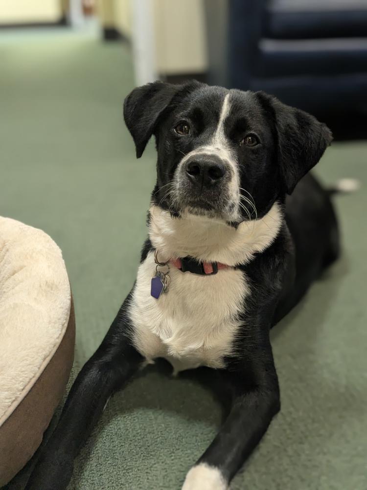 Pet Description:Mid size, mostly black with white strike down face and chest, white paws and white tipped tail. Wearing two pink collars. |