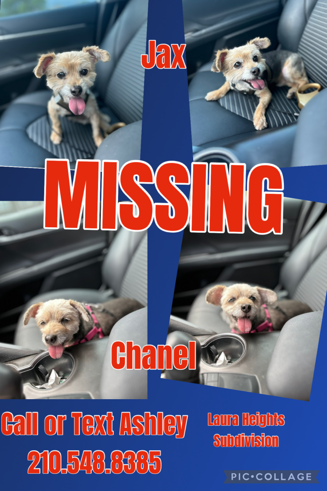 Pet Description:Jax (male)and Chanel (female)are lost Their hair is a bit longer than these pics Jax has his green harness on |