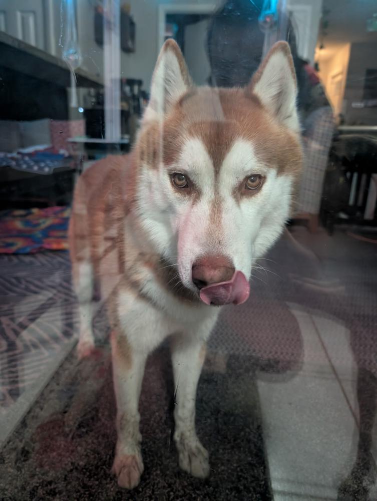 Pet Description:Brown and white male husky. Very sweet. Followed us home on our walk with our dogs. |