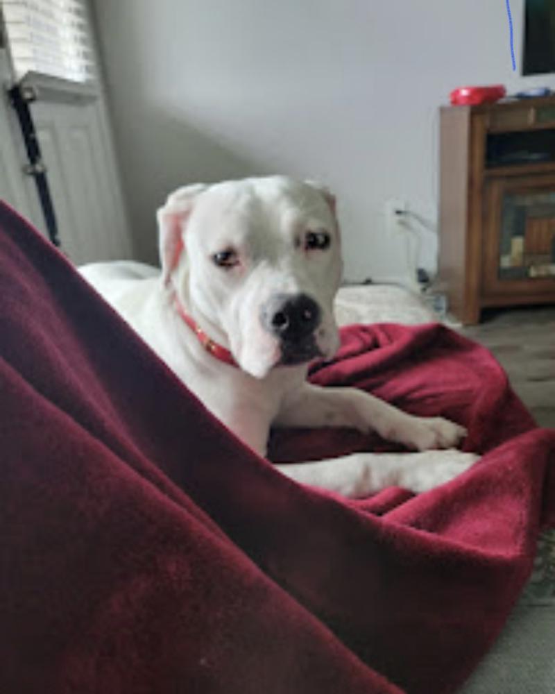 Pet Description:White with black spots. Was wearing purple training collar |