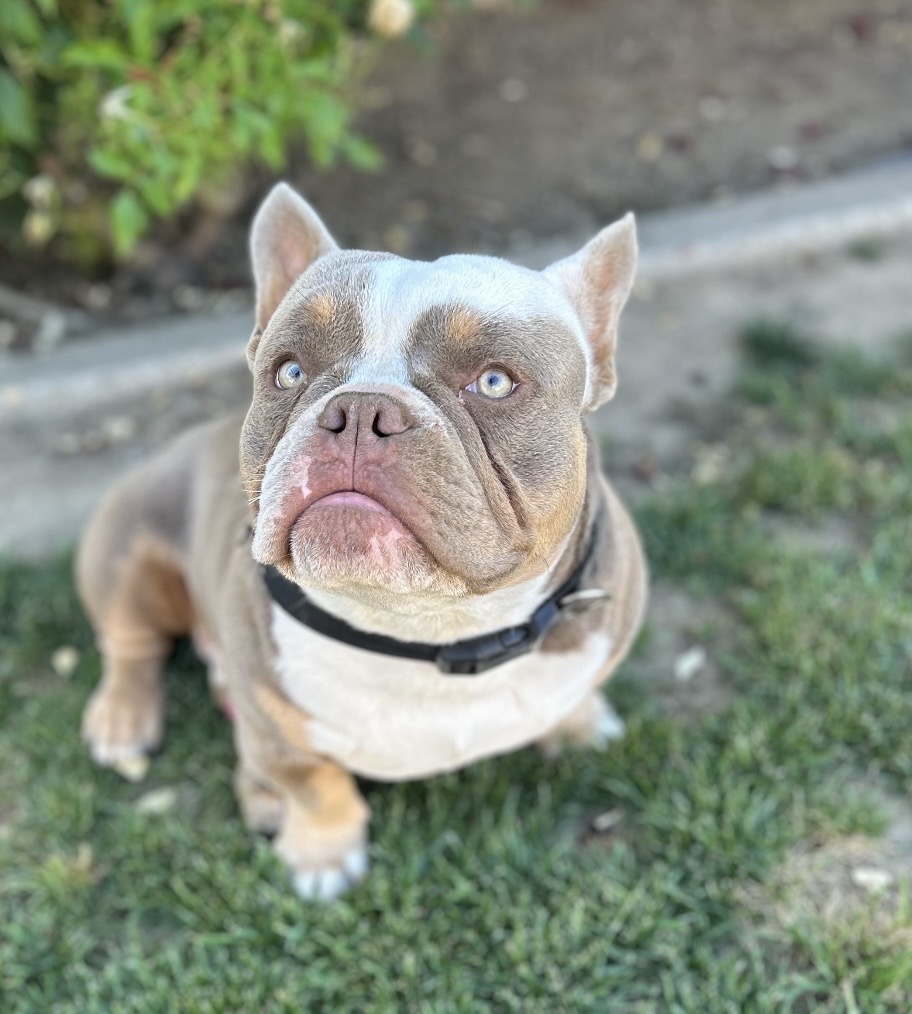 Pet Description:He’s a pocket bully white, grey and tan color. He’s really friendly loves people. He’s wearing a red collar |