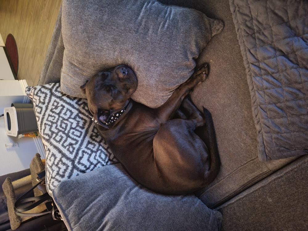 Pet Description:He is a dark chocolate brown, almost black neutered has a patch of white on his chest |