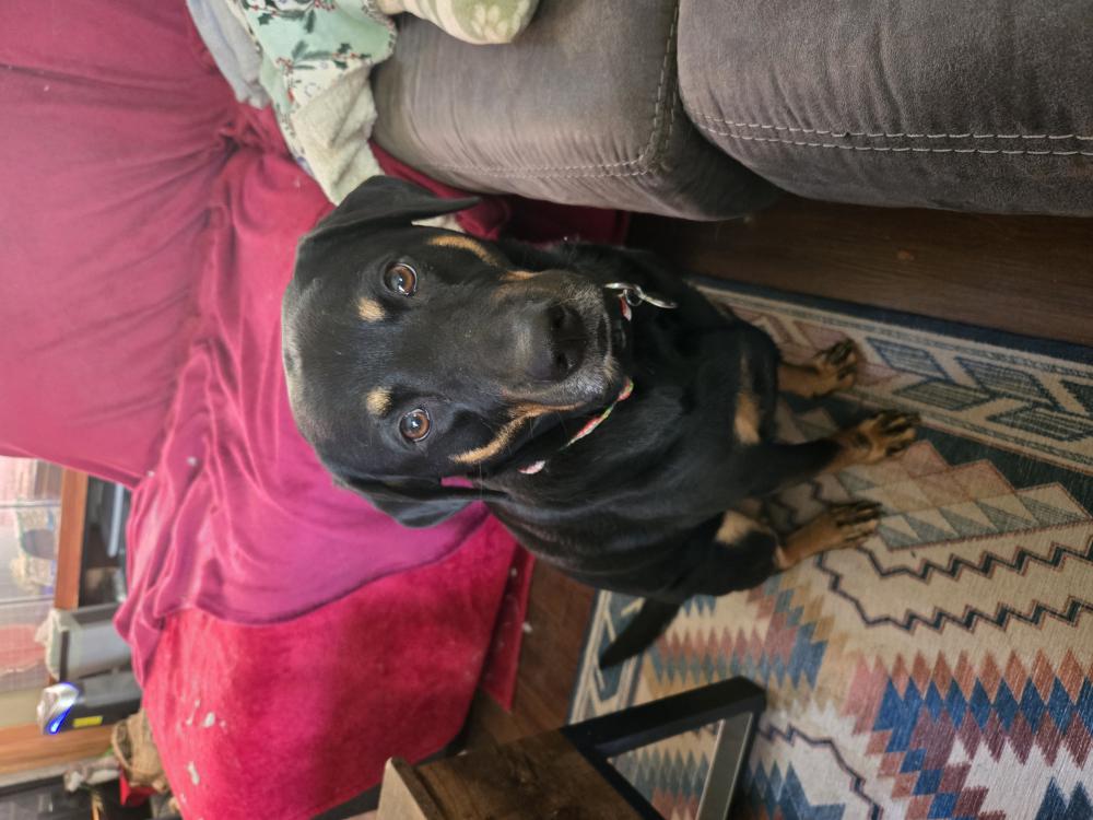 Pet Description:She is about 50 lbs and has marking similar to a doberman or Rottweiler. She is very friendly, but skiddish. |