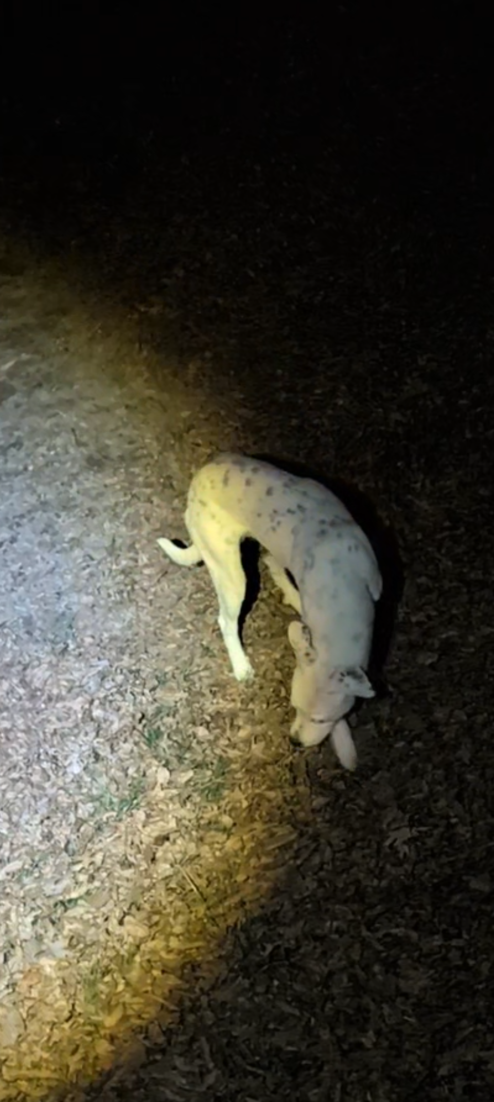 Pet Description:Medium-sized, lean/athletic buildWhite coat with black/gray spots (ticking)Short hair, floppy earsAppears young (puppy/young adult)Very friendly, curious, playful, and people-orientedNo collar or tags seenHe has been around this area recently and may return to familiar yards or food sources. |