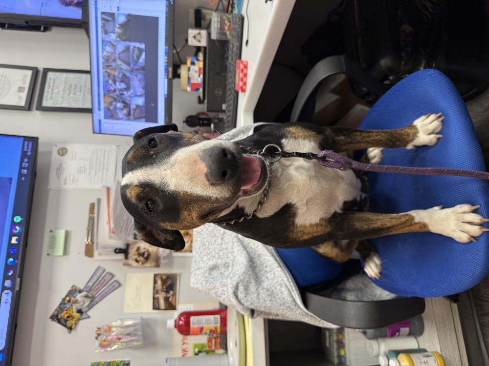 Pet Description:Medium sized, black and white with some brown bull terrier wearing a choker collar |