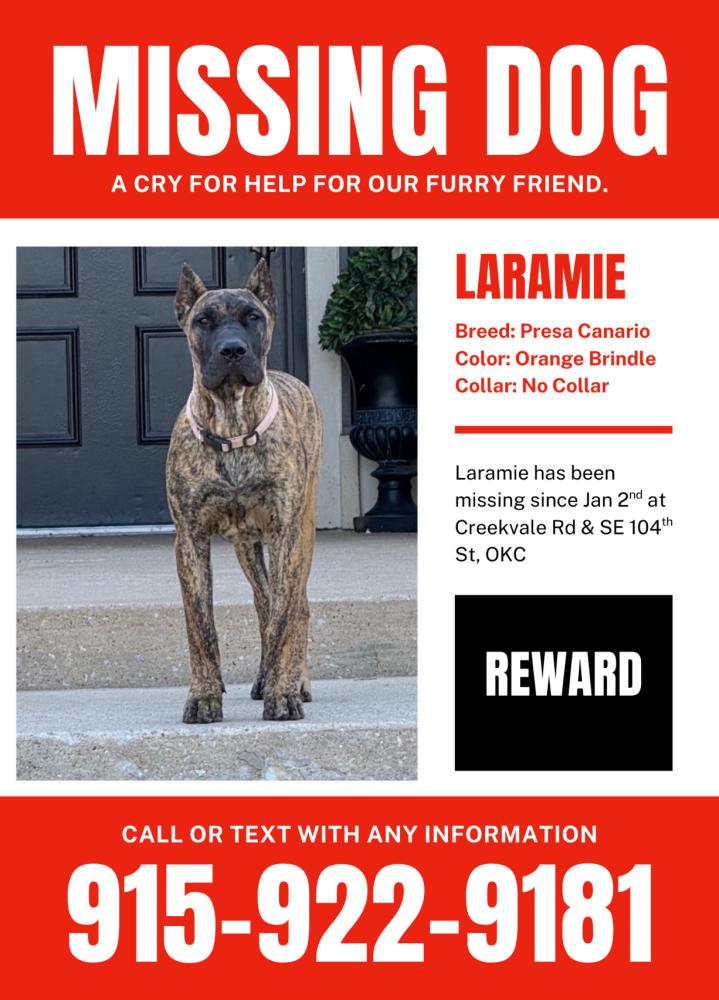 Pet Description:Orange Brindle, Black Mask, 90lbs, 8 months old - very friendly |