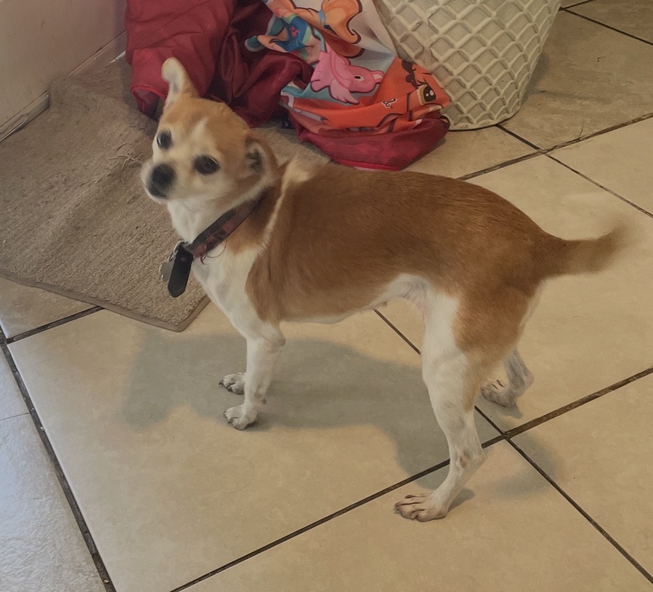 Pet Description:Lanky and skinny brown and white Chihuahua with floppy ears. Is timid and scared away by people, but warms up quickly. Usually wearing black and red plaid collar with a bone name tag, but it might’ve fallen off. |