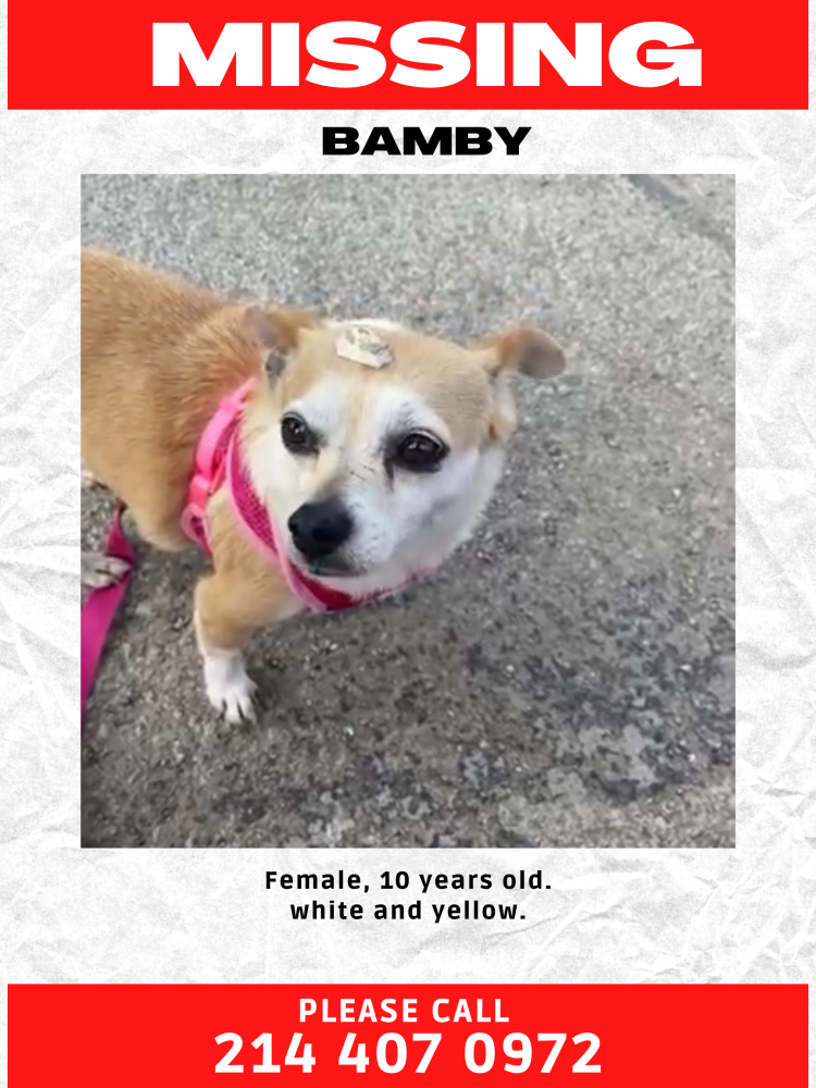 Pet Description:Bambi is a sweet blonde chihuahua 10 years old very friendly and obedient. She got lost the night of new year day likely due to hearing city celebrations. She is missed please help us find her in Oak Cliff Dallas TX |