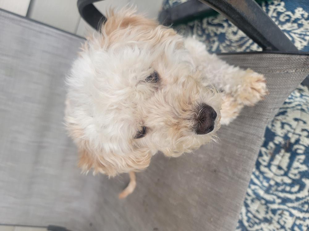 Pet Description:Small whitish-blonde dog wearing a blue collar. He is neutered with the tattoo on his left inner back leg. He has food allergies, and he needs to get home. |