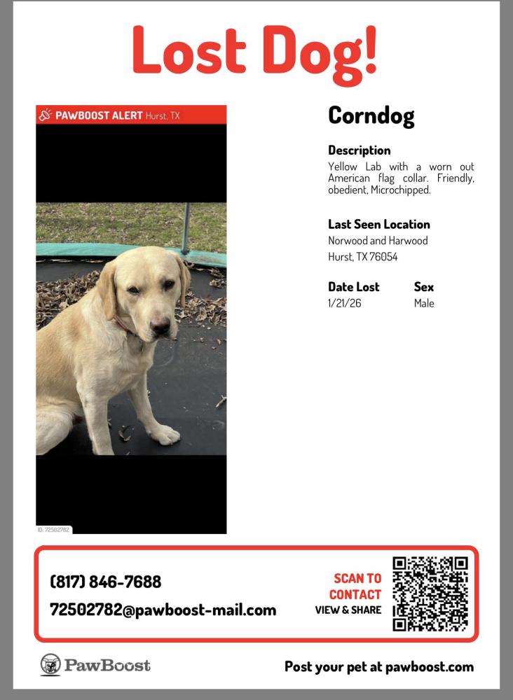 Pet Description:Large yellow male Labrador Retriever. Spotted twice since disappearing but is frightened and in flight mode! |