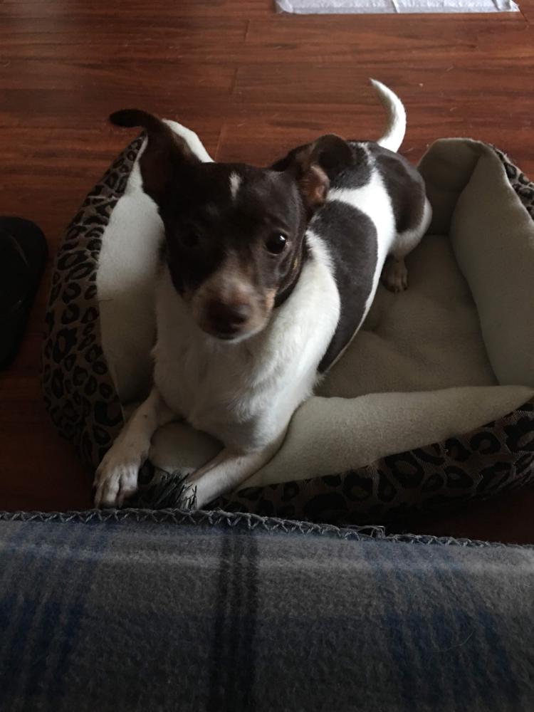 Pet Description:She is small. Mostly black with white on her she is mixed with a terrier. |