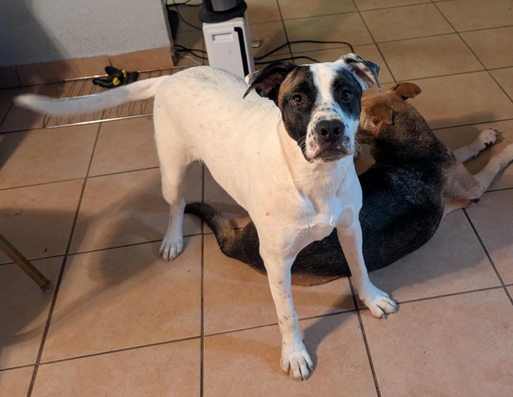 Pet Description:Daisy is a white pitbull mix, about 60lbs, with two dark/brown color patch around her eyes. She's a large dog. Very jumpy. |