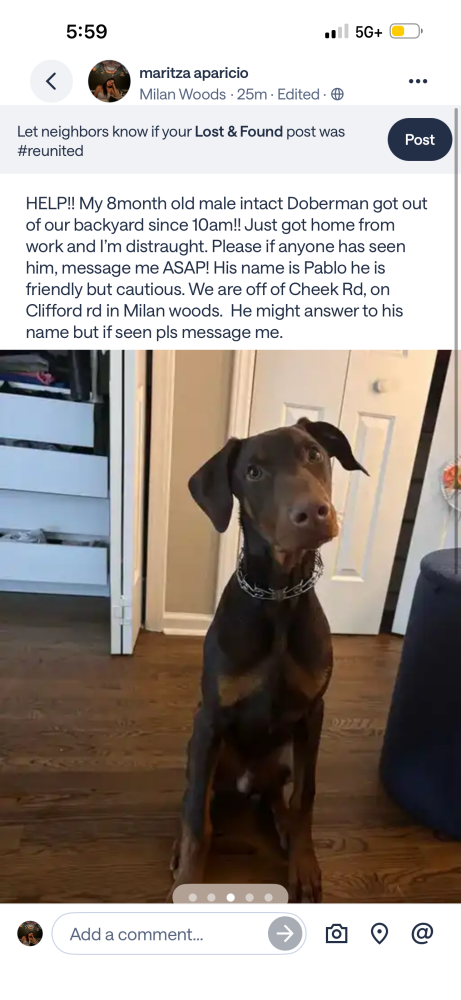 Pet Description:8month old Doberman, friendly but cautious. Call 9195198494 |