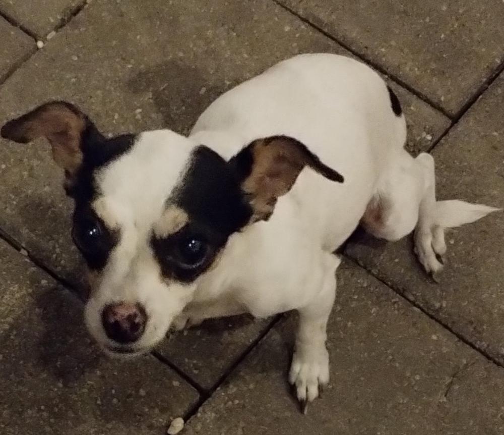 Pet Description:Small white dog with black and brown around her eyes. She has two black circles on her left hind leg. Her nose is pink from digging. |