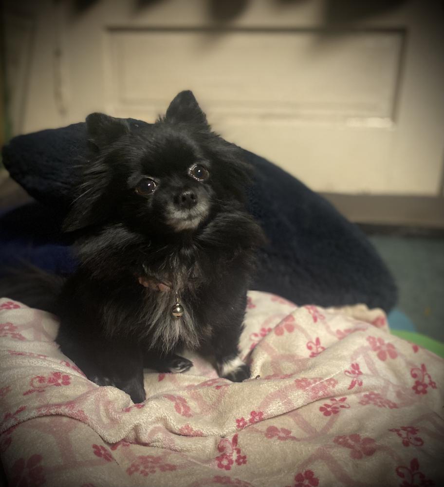 Pet Description:She’s a small mostly black with a Few splashes of white on her chest, chin, and front paws, Pomeranian. She’s very sweet but also shy. We believe she may have been picked up out of the yard |