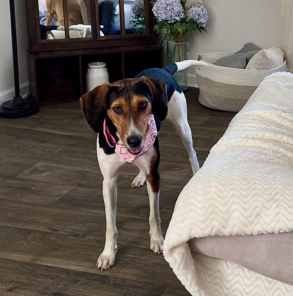 Pet Description:She is maybe 30lbs black, brown and white hound dog |