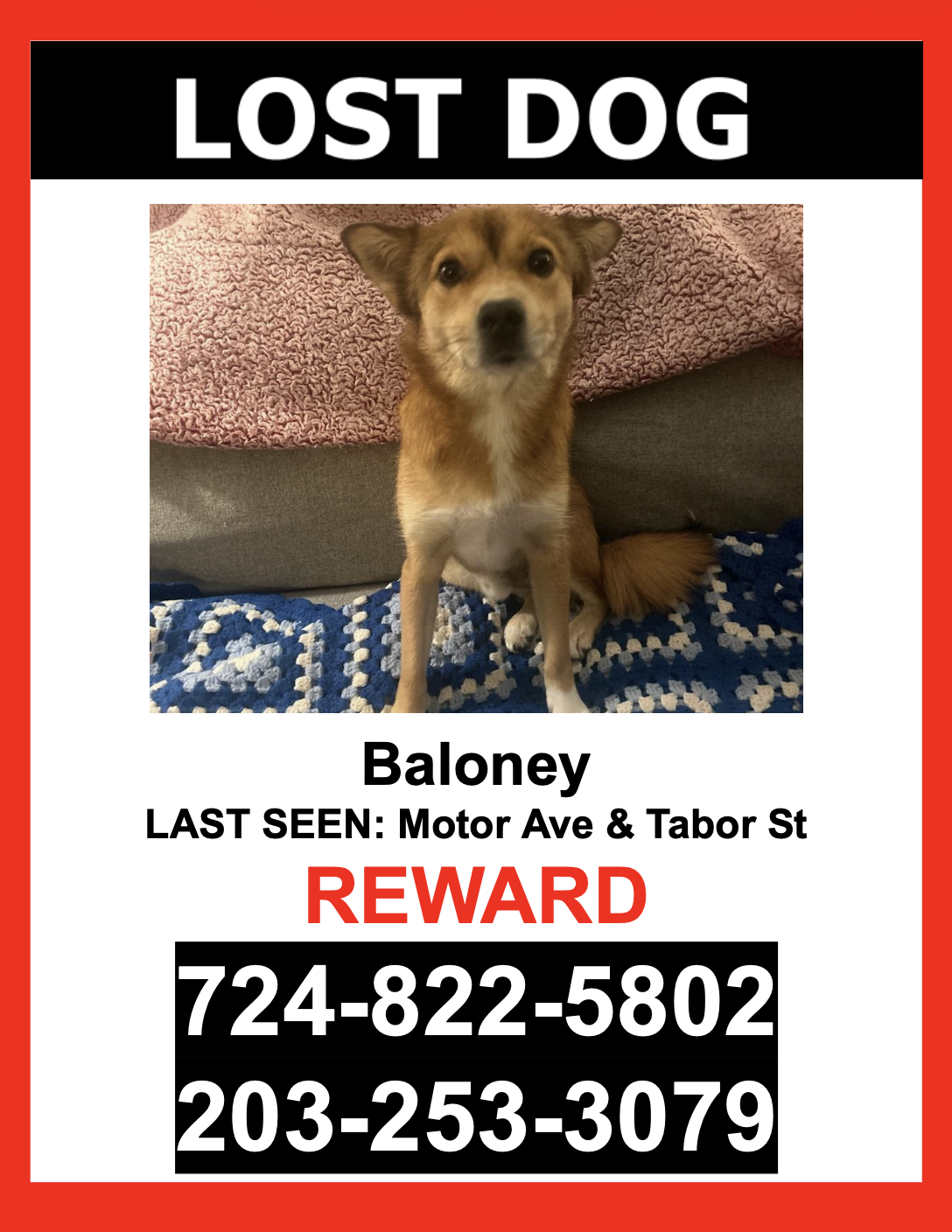 Pet Description:**MISSING SINCE 3/13/2026 AT 8:00 PM** Baloney is a male, brown with white chest & paws, Shiba Inu who escaped and was last seen near Motor Ave & Tabor St. Baloney IS NOT wearing a collar or harness but IS microchipped. If you see Baloney please DO NOT CHASE HIM. PLEASE CALL OR TEXT ONLY. 724-822-5802 or 203-253-3079$$ Reward $$ |
