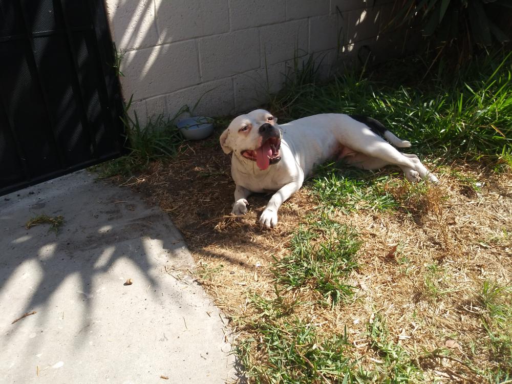 Pet Description:All white Pit/ Bull Dog MIx with a black patch on rear |