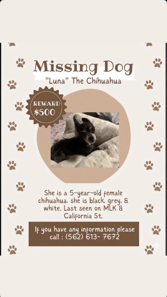 Pet Description:SMALL BLACK/GREY & WHIT CHIHUAHUA NAMED LUNA. WHITE PAWS, WHITE SNOUT. |